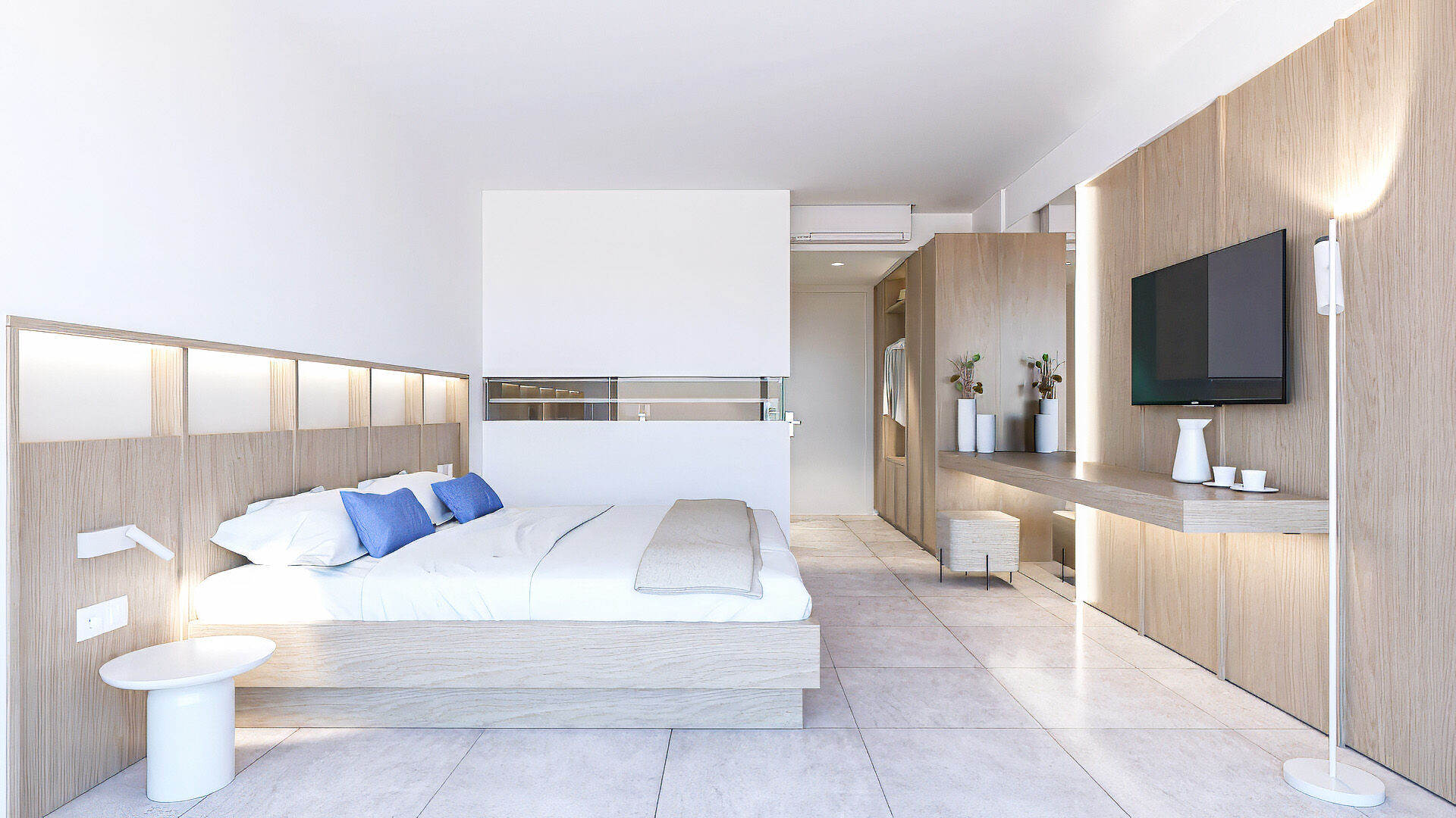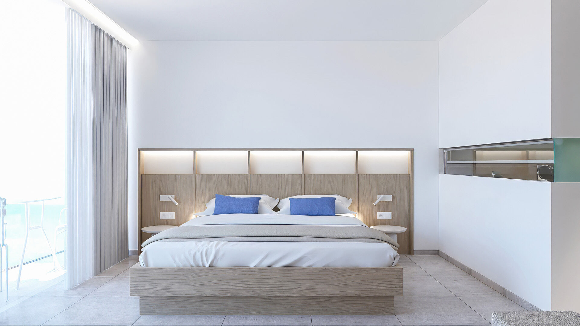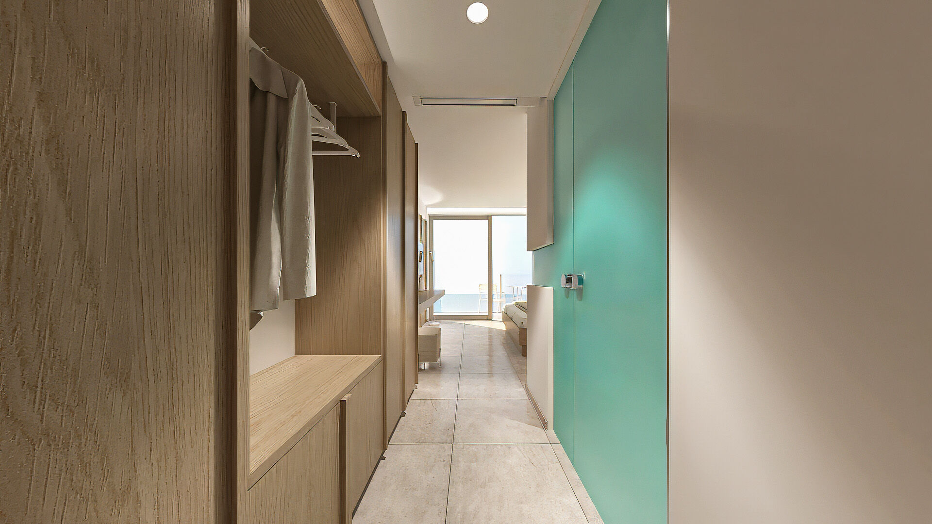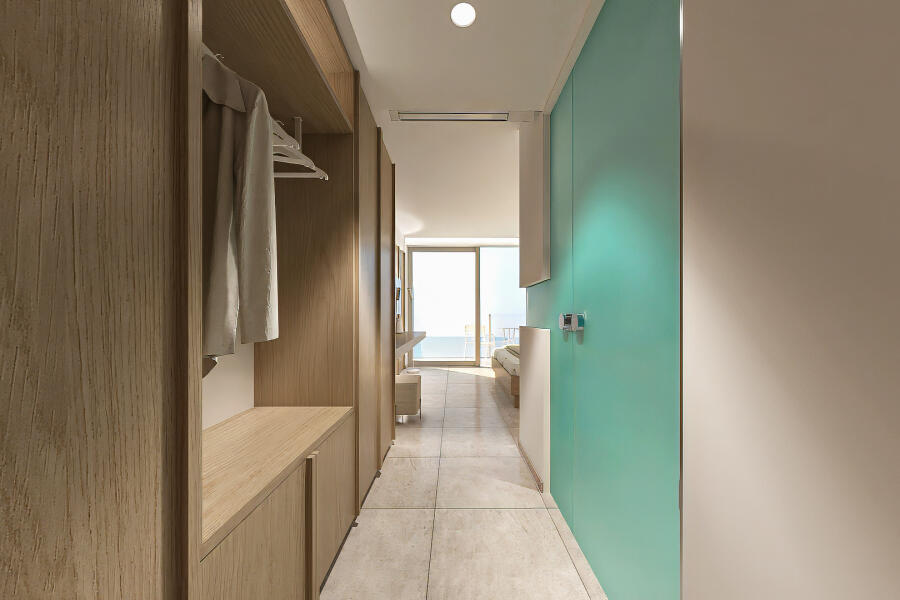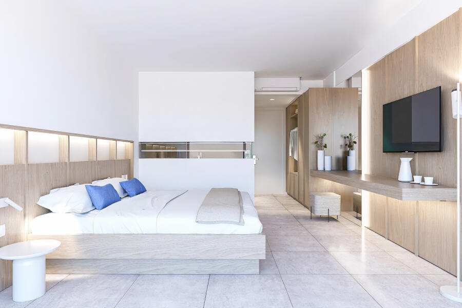 Η απ’ άκρη σ’ άκρη τζαμαρία μπροστά από το κρεβάτι επιτρέπει την ανεμπόδιστη θέα, ενώ το γυάλινο μπαλκόνι μοιάζει με εξώστη που ανυπομονεί να γεμίσει θεατές. Μάλιστα, ακόμη και στο μπάνιο η θέα δεν εξαφανίζεται, καθώς μια λεπτή γραμμή από τζάμι ενσωματωμένη στον διαχωριστικό τοίχο εξασφαλίζει την επικοινωνία με τη θάλασσα. Η διακόσμηση στο εσωτερικό είναι λιτή και διακριτική ώστε να αποφευχθούν οι παρεμβολές στα παιχνιδίσματα της φύσης. Το γυαλί και το ξύλο κυριαρχούν και δημιουργούν μια αίσθηση αφαιρετικής πολυτέλειας.