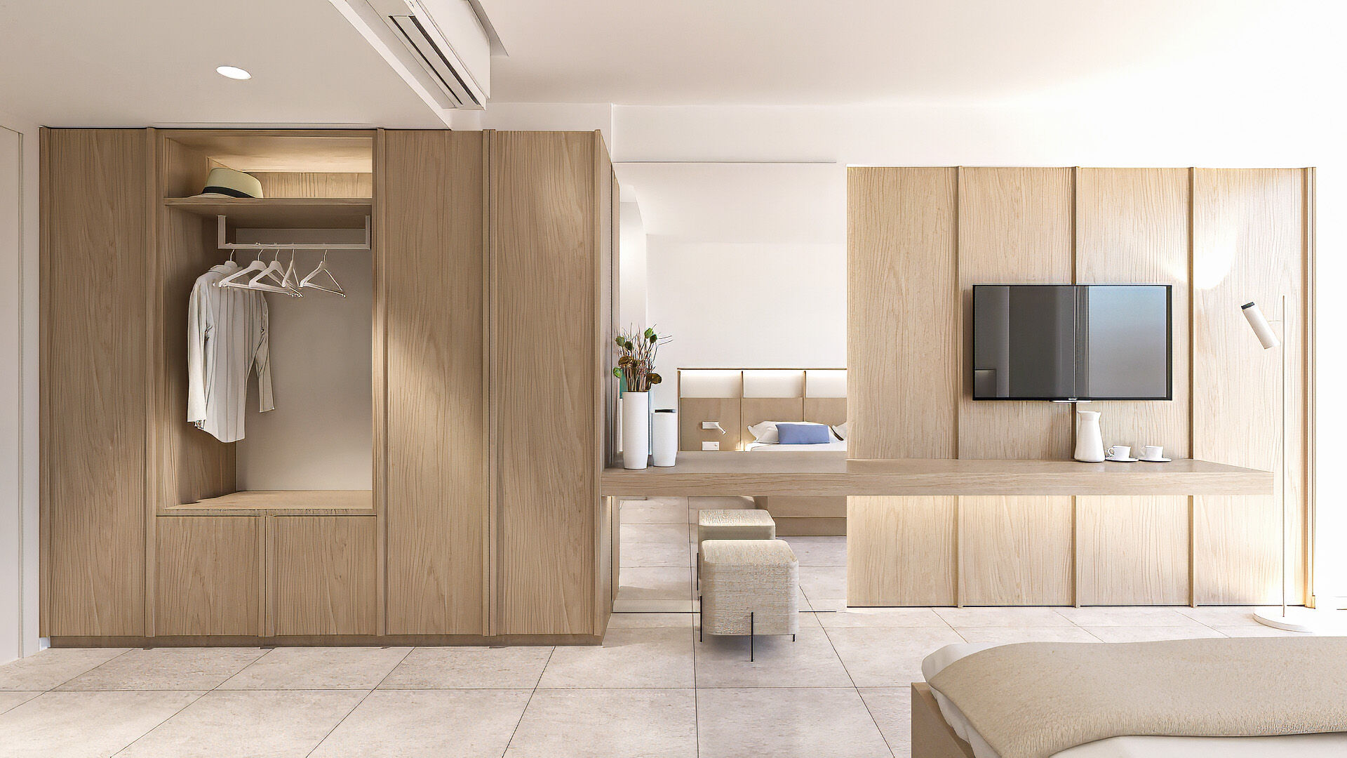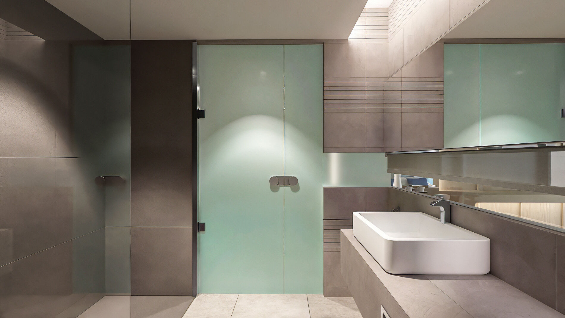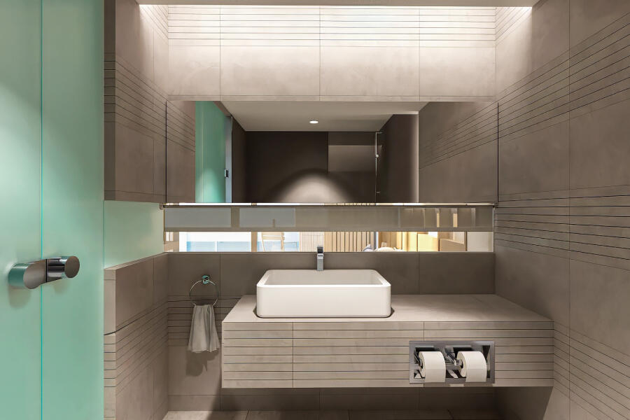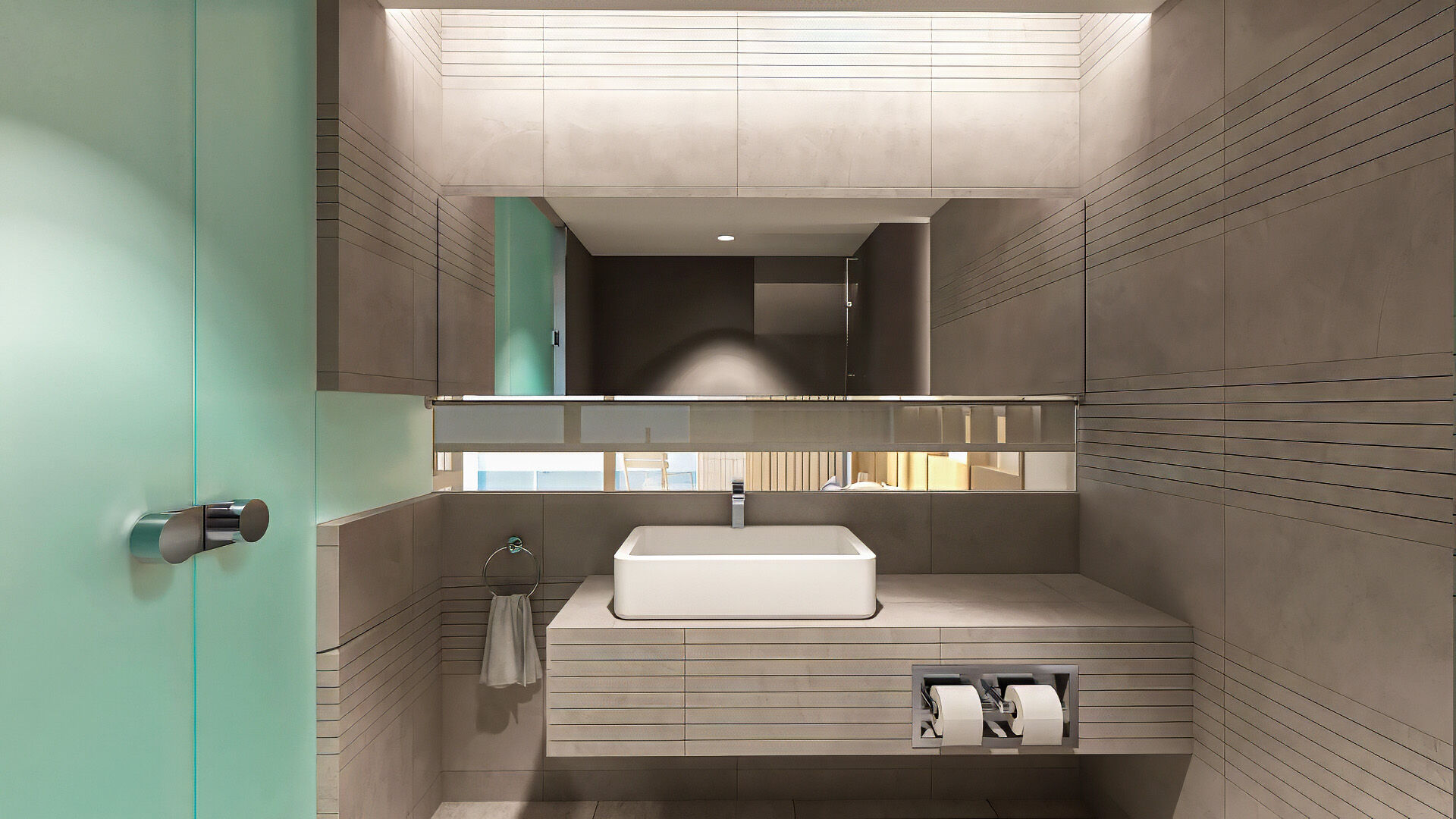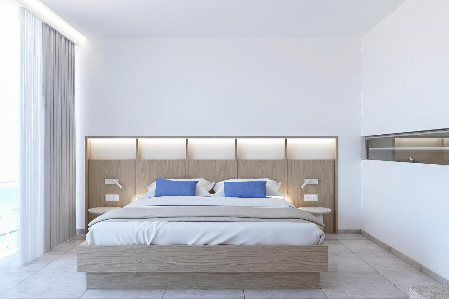 Η απ’ άκρη σ’ άκρη τζαμαρία μπροστά από το κρεβάτι επιτρέπει την ανεμπόδιστη θέα, ενώ το γυάλινο μπαλκόνι μοιάζει με εξώστη που ανυπομονεί να γεμίσει θεατές. Μάλιστα, ακόμη και στο μπάνιο η θέα δεν εξαφανίζεται, καθώς μια λεπτή γραμμή από τζάμι ενσωματωμένη στον διαχωριστικό τοίχο εξασφαλίζει την επικοινωνία με τη θάλασσα. Η διακόσμηση στο εσωτερικό είναι λιτή και διακριτική ώστε να αποφευχθούν οι παρεμβολές στα παιχνιδίσματα της φύσης. Το γυαλί και το ξύλο κυριαρχούν και δημιουργούν μια αίσθηση αφαιρετικής πολυτέλειας.