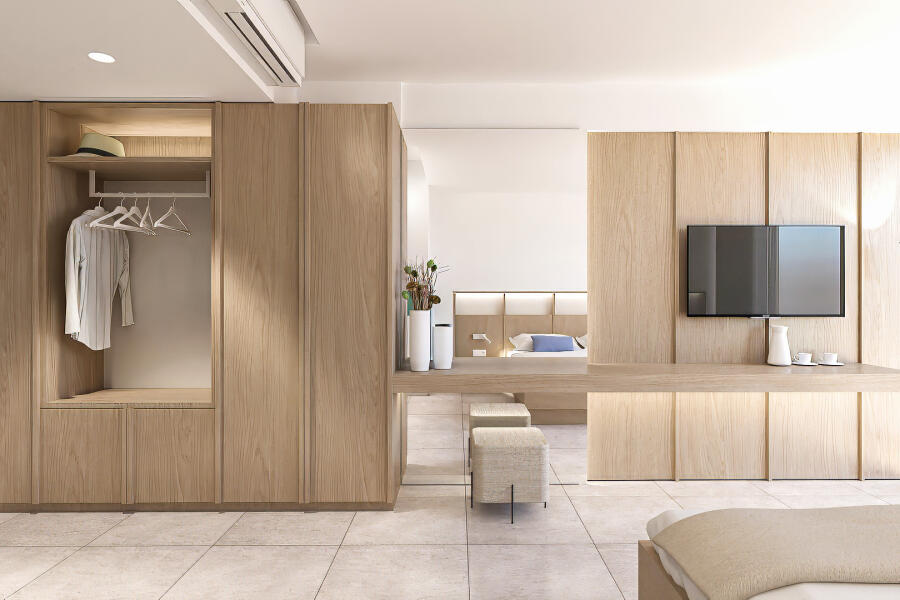 Μπλε παντού, στη θάλασσα και στον ουρανό. Ανατέλλει καινούργια μέρα, ένα δυνατό φως απλώνεται στον ορίζοντα. Πέφτει για ύπνο ο ήλιος, βάφει μωβ και κόκκινα τα σύννεφα. Είναι ολόγιομο το φεγγάρι, φωτίζει κάθε μυστικό του Αιγαίου. Και στη βροχή, θαρρείς θάλασσα κι ουρανός γίνονται ένα σώμα, μία επιφάνεια. Είναι τόσες οι εναλλαγές του σκηνικού που το ίδιο δωμάτιο φαντάζει διαφορετικό στη διάρκεια της ημέρας. Αυτή την καθημερινή παράσταση χρωμάτων που σκηνοθετεί αδιάκοπα η φύση βιώνουν όσοι μένουν σε ένα από τα τριάντα έξι δωμάτια του «Kos Aktis». Το βράδυ νανουρίζονται με τον παφλασμό των κυμάτων, το πρωί ρουφάνε αισιοδοξία από την απεραντοσύνη του γαλάζιου.